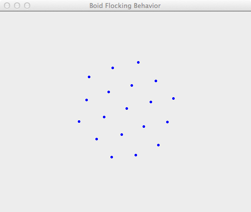 Boids have converged to a hexagon resembling the molecular structure of benzene, or water molecules in an ice crystal, among others (19 boids, min separation = 30, ock threshold = 100, separation factor = 0.13, alignment factor = 0.16, cohesion factor = 0.01, friction = 4.2)